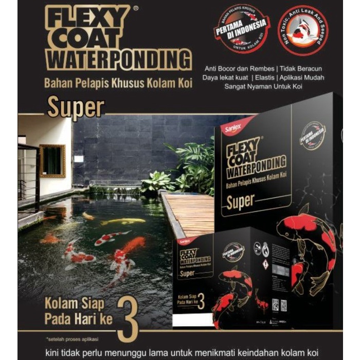 Untuk area sudutan dapat diperkuat juga dengan aquaproof polyester mesh saat lapisan pertama aquagard masih basah. Berfungsi sebagai lapisan anti bocor untuk internal dan eksternal, menutupi keretakan pada beton, mortar dan bata; Flexycoat waterponding adalah bahan pelapis khusus kolam koi/ikan hias (anti bocor dan rembes) yang aman untuk ikan. Untuk area sudutan dapat diperkuat juga dengan aquaproof polyester mesh saat lapisan pertama aquagard masih basah. Yaitu kolam hanya difinalisasi dengan beton kasar dan tidak dilapisi dengan lapisan anti bocor yang benar.